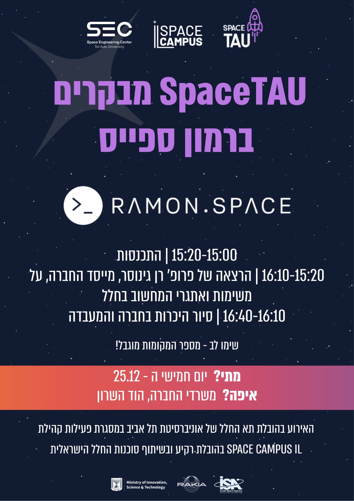 מה בתוכנית: הרצאה של פרופסור רן גינוסר מייסד החברה על משימות ואתגרי המחשוב בחלל לאחר מכן סיור קטן במעבדה היכרות עם מוצרי החברה